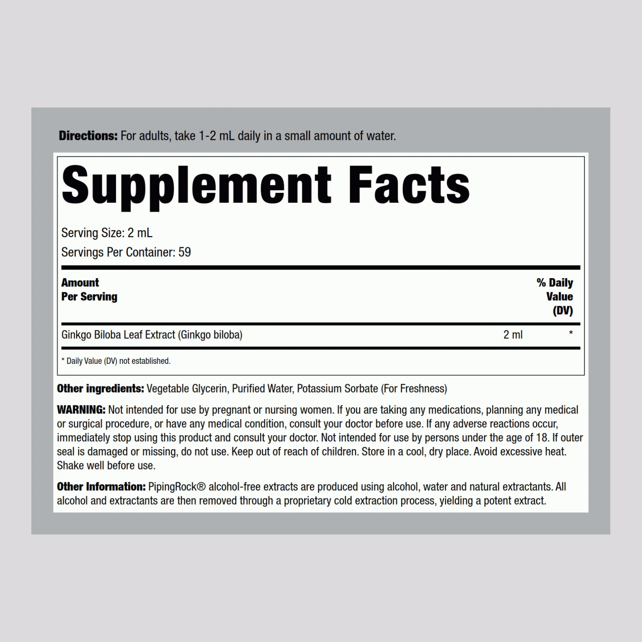 Piping Rock® alcohol-free extracts are produced using alcohol, water and natural extractants. All alcohol and extractants are then removed through a proprietary cold extraction process, yielding a liquid extract. Processed in our cGMP facility.